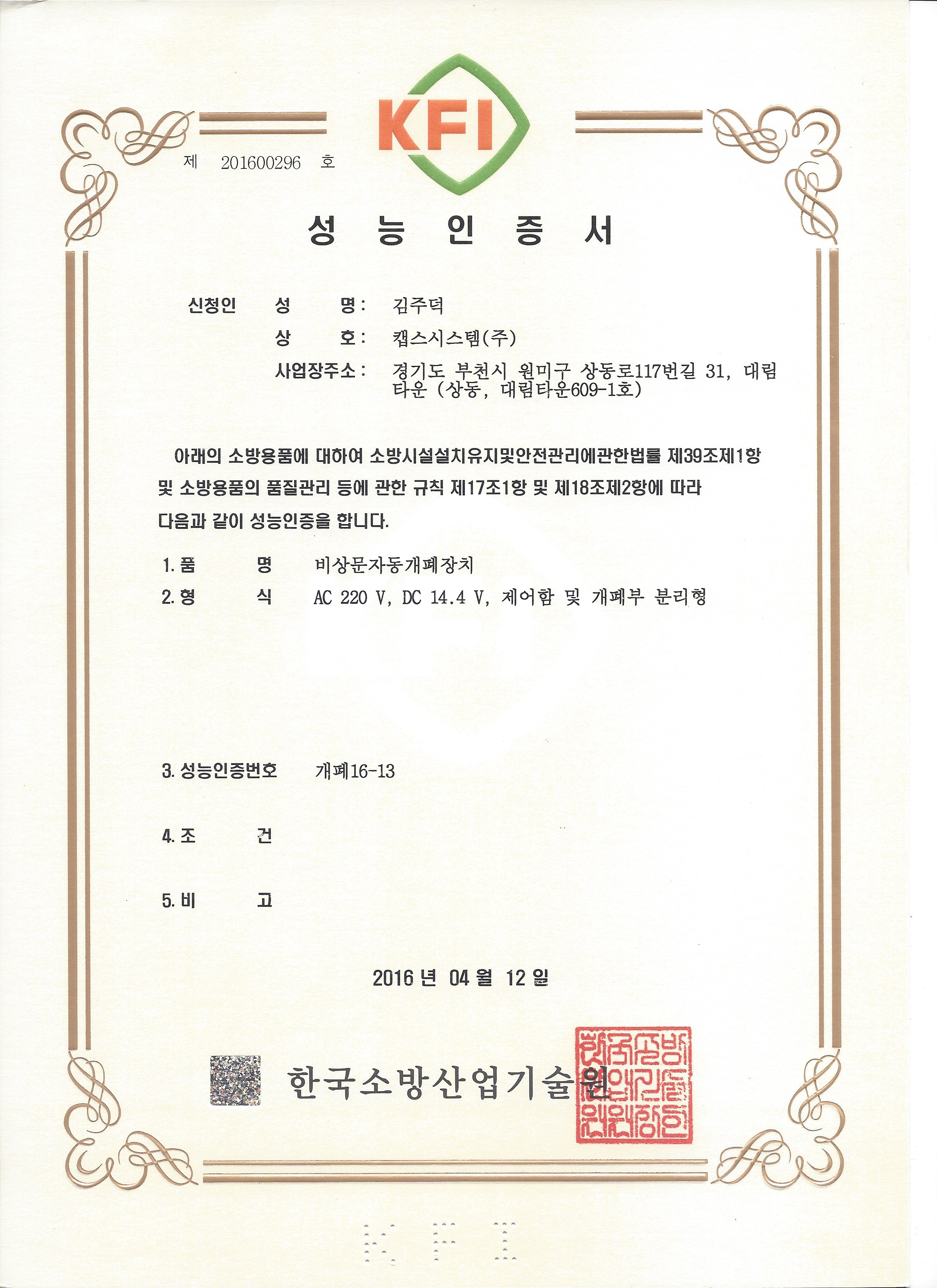 KFI 인증서 개폐16-13